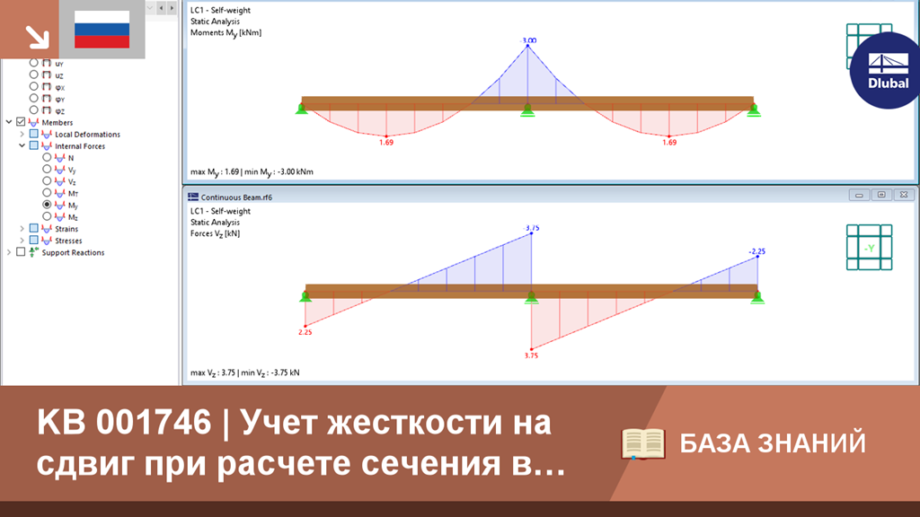 В этом видео показаны внутренние силы и смещения неразрезной балки, рассчитанные как с учетом жесткости на сдвиг, так и без нее.
