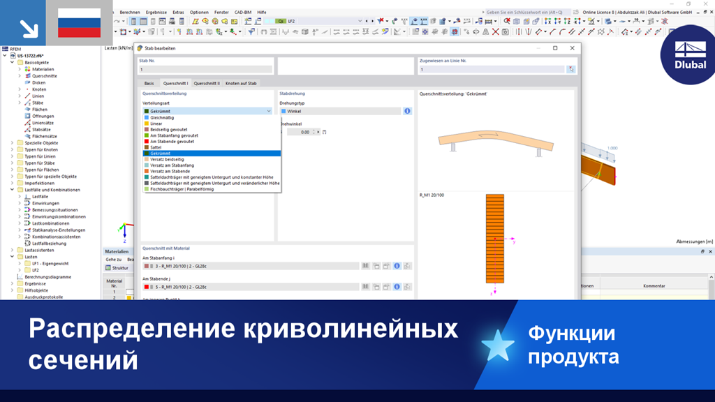 Хотите рассчитать криволинейные балки (например, из клеёного бруса)? Для этого можно использовать различные распределения сечений для стержней:
