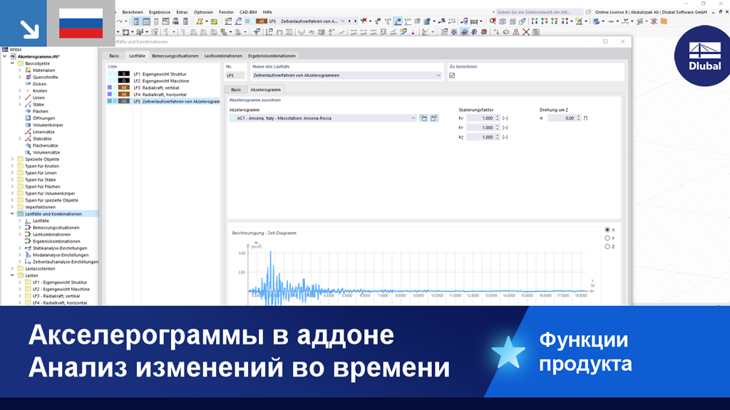 Доступна обширная база данных записей землетрясений, но вы также можете создавать или импортировать свои собственные диаграммы. Расчёт изменений во времени выполняется с помощью модального анализа или линейного неявного анализа Ньюмарка.