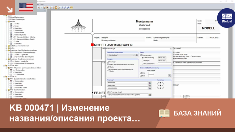 Чтобы изменить название модели для протокола результатов, щелкните по кнопке [Задать заголовок], после чего откроется диалоговое окно «Заголовок протокола результатов». Затем, после отметки флажков в разделе «Изменить имя/обозначение проекта» или «Изменить имя/обозначение модели», активируются соответствующие поля для ручного ввода данных. Сначала там появятся соответствующие записи из основных данных. Изменения в имени/описании модели затем немедленно отразятся также в заголовке протокола результатов.