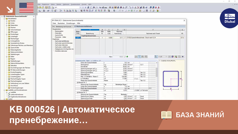 Чтобы иметь возможность рассчитывать сечения с криволинейными частями сечения (например, из программы SHAPE ‑ THIN), вы можете автоматически игнорировать криволинейные части сечения до определенного определяемого отношения c/t. Это имеет смысл для небольших округлений; например, для больших криволинейных частей сечения необходимо вручную ввести класс сечения и, при необходимости, проверить местную потерю устойчивости.