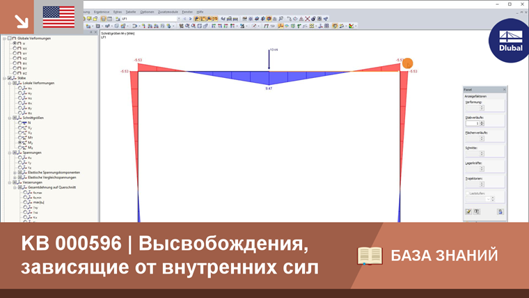 Тип нелинейности «Частичное действие» позволяет дифференцированно управлять передачей внутренних сил. В данном примере описывается защемленная рама с моментным шарниром в одном из углов. В случае превышения изгибающего момента My , равного ± 6 кНм, соединение должно деформироваться. В LC 1 этот предельный момент не достигается. Возникает симметричное распределение момента.