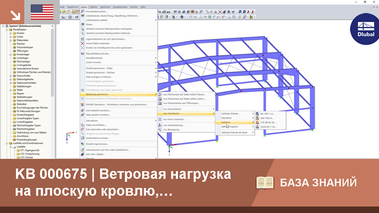 В программе RFEM 5 и RSTAB 8 затем предлагается и специальный генератор ветровой нагрузки для плоских и скатных крыш. Частный случай кровли с пологим скатом меньше 5 градусов распознаётся генератором нагрузки как форма двускатной кровли. В этой ситуации так генератор автоматически применит спецификацию нагрузки для эквивалентной плоской кровли.