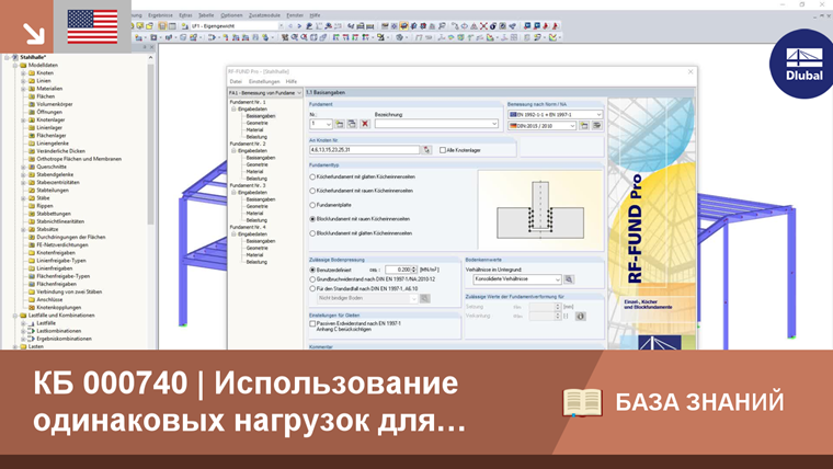 При задании нескольких различных фундаментов в одном корпусе модуля нагрузка должна быть определена для каждого фундамента. В подробных настройках корпуса модуля, в разделе «Нагрузки в окне 1.4», находится функция «Равные для всех оснований». Выбирая эту функцию, вы применяете одинаковые нагрузки ко всем основаниям. Это уменьшает усилия по определению нагрузок на один фундамент.