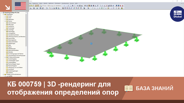 Im Zusatzmodul RF-GLAS ist zur Erleichterung der Definition der Auflagerbedingungen das 3D-Rendering implementiert. Durch diese interaktive graphische Visualisierung wird dem Anwender eine erleichterte Eingabe und Kontrolle der Linien- und Knotenlagerung ermöglicht. Die schematische Darstellung kann bei Bedarf jedoch auch ausgewählt werden.