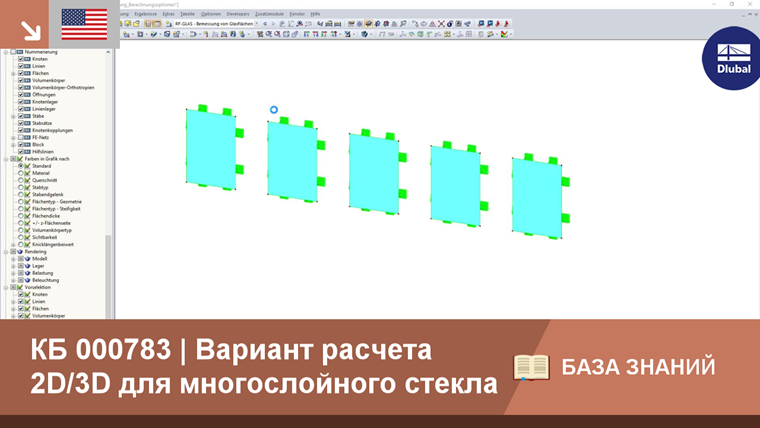 Bei der Glasbemessung im Zusatzmodul RF-GLAS stehen grundsätzlich zwei verschiedene Berechnungsoptionen zur Verfügung: eine 2D- und eine 3D-Berechnung. Grundsätzlicher Unterschied dieser beiden Bemessungsvarianten ist die vom Programm automatisierte Modellierung der Scheiben im temporären Modell. Bei einer 2D-Bemessung werden für die einzelnen Scheiben gängige Flächenelemente (Plattentheorie) generiert, während bei der 3D-Bemessung die einzelnen Scheiben als Volumen abgebildet werden. Je nach gewähltem Schichtaufbau steht die Option zur Wahl oder wird vom Programm bereits automatisch vorgegeben.