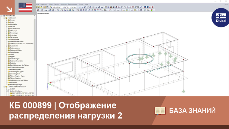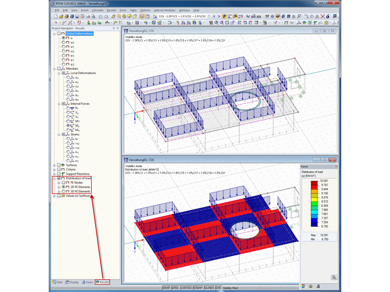 Одним из решений этой проблемы является отображение распределения нагрузки в навигаторе результатов. Таким образом, элементы 2D КЭ графически раскрашиваются и им присваиваются соответствующие значения на смежной цветовой панели. Кроме заданных нагрузок на площадь, учитывается также собственный вес. При необходимости цвет панели можно скорректировать.