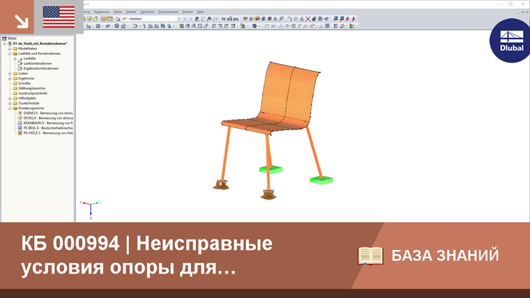 Поскольку ножки стула представлены в виде стержней, можно и целесообразно использовать модель с узловой опорой. Данная нелинейность (в данном случае «отказ всех, если PZ 'отрицательна») присутствует также в RFEM 5 и RSTAB 8.