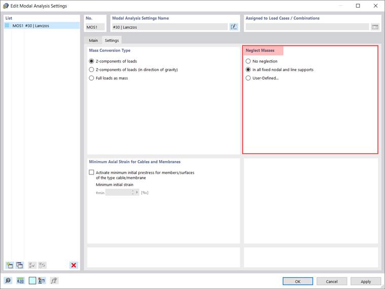 Поскольку эти проблемы часто возникают, RFEM 6 позволяет вам пренебрегать массой определённых частей конструкции для целей модального анализа. Способ, каким массы будут учитываться в модальном анализе, можно определить в параметрах модального анализа, как показано на Изображении 2. В отличие от опции "Не пренебрегать" (то есть, массы не будут пренебрегаться), можно выбрать между двумя опциями пренебрегания массами: пренебрегать массой во всех жёстко закреплённых узловых и линейных опорах, или создать самостоятельно выборку отдельных объектов.