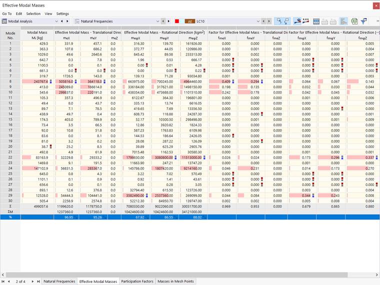 Результаты всех мод показаны на Изображении 8. Заметно, что необходимо рассчитать тридцать мод, чтобы достичь требуемых 90% в обоих направлениях x и y (точнее говоря, достигнуто 96,95% в направлении x и 95,26% в направлении y). Таким образом, чтобы достичь 90%, необходимо рассчитать больше собственных значений; однако чем больше собственных значений нужно рассчитать, тем более времязатратным будет расчёт, особенно в случае крупных конструкций.