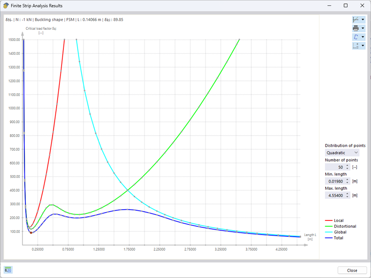 Если выбрать одну из удельных внутренних сил, то откроется интерактивная диаграмма «Результаты метода конечных полос». Графическое изображение синего цвета показывает минимальную критическую нагрузку в качестве функции соответствующей длины полуволны потери устойчивости. Результаты можно отобразить отдельно для различных форм устойчивости, таких как местная потеря устойчивости, деформированная потеря устойчивости и общая потеря устойчивости (для однопролетной балки с вильчатым опиранием) (рисунок 2).