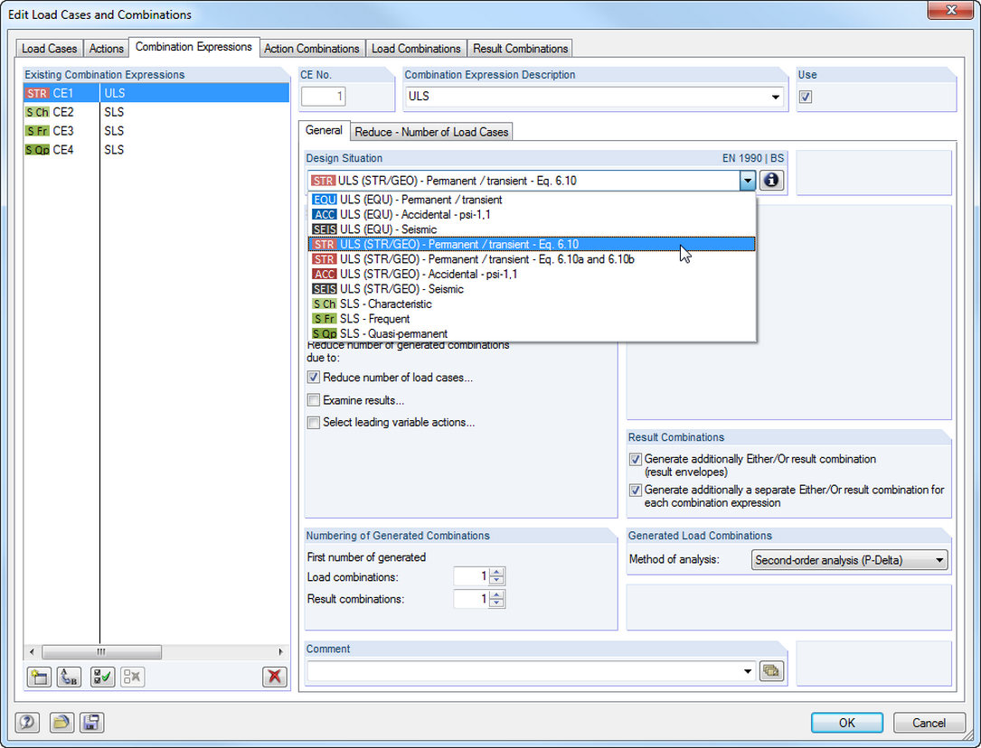 Для сочетания воздействий в предельном состоянии по несущей способности и по пригодности к эксплуатации можно выбрать различные расчетные ситуации по требуемым нормам (например, ПСНС (STR/GEO) - постоянная / временная, ПСПЭ - квази-постоянная и другие).