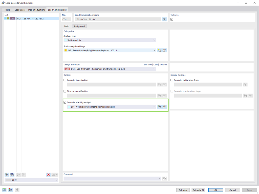 Если в программе появляется загружение или сочетание нагрузок, активируется расчет на устойчивость. Чтобы учесть, например, начальное предварительное напряжение, затем можно определить другое загружение.