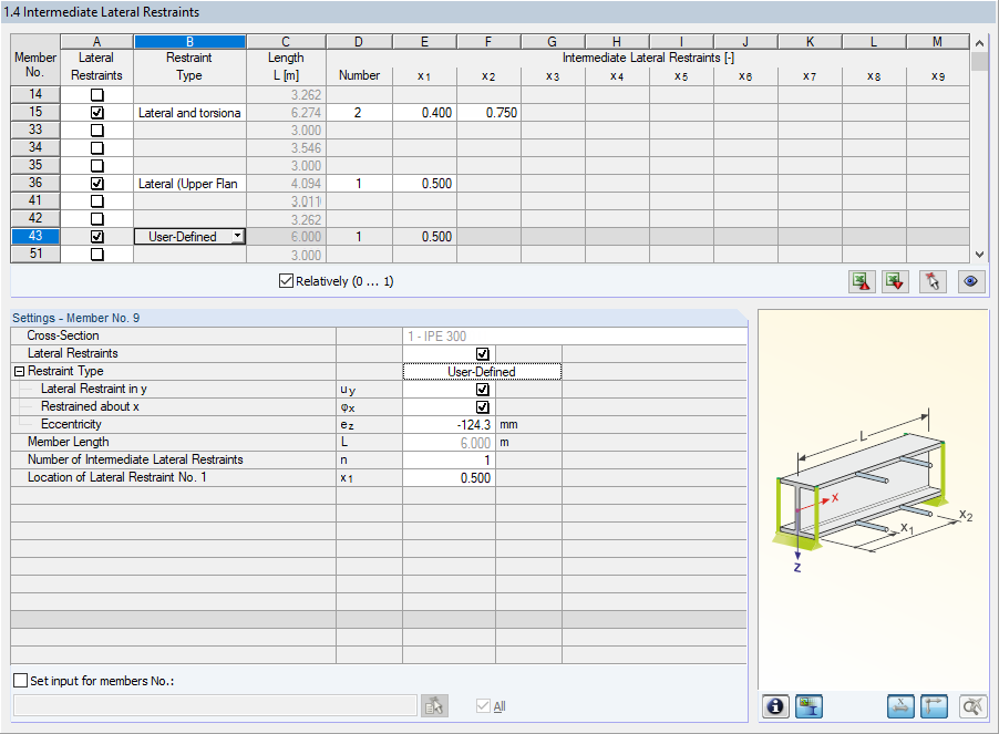 В программах RFEM 5 и RSTAB 8 промежуточное защемление представляет собой одно или несколько дополнительных защемлений, которые можно задать между опорами. Они особенно важны для расчета упругого критического момента Mcr при потере устойчивости плоской формы изгиба.