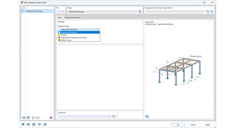 Трапециевидный лист может быть выбран из библиотеки. Геометрические параметры, такие как длина сдвигового поля или расстояние между стойками, можно графически определить в рабочем окне.