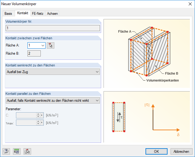 - Eigenschaften des Kontakts parallel zu den beiden Flächen (volle Kraftübertragung, Ausfall bei keiner Wirkung des Kontakts senkrecht zu den Flächen, starre oder elastische Reibung jeweils mit oder ohne Begrenzung, linear elastisches Verhalten)