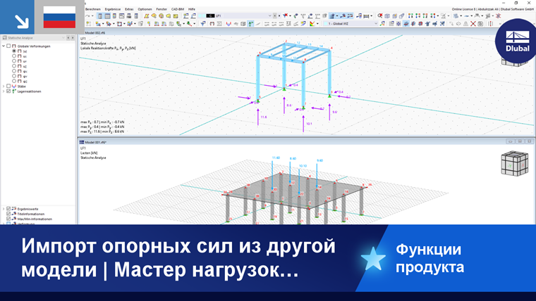 Выберите «исходную модель» в списке 'Соединённая модель' (см.рисунок {%ref#image043304 Новый мастер нагрузок | Импорт опорных реакций]]). Вы также можете выбрать его в Центре Dlubal с помощью