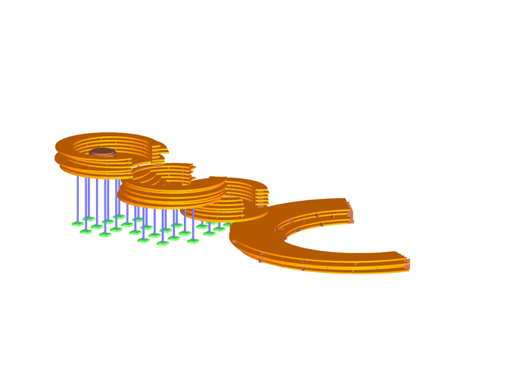 Вся конструкция была рассчитана и спроектирована в программе RFEM с использованием дополнительного модуля RF-LAMINATE, который позволил помимо широко используемого материала APA PRG 320 задать в модели также индивидуальные и уникальные слои CLT. Эти пользовательские композиции были далее назначены 84 изогнутым поверхностям, которые вертикально соединяются друг с другом посредством деревянных элементов меньшего размера. Дополнительно был для панелей CLT выполнен также расчет напряжений. Однако особое внимание уделялось и результатам расчета прогибов и продавливания.