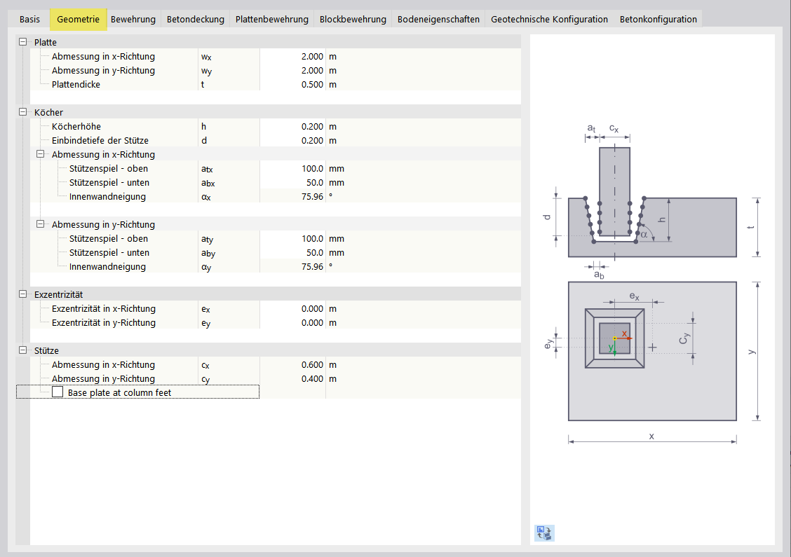 几何选项卡管理着基础板和杯口基础的尺寸。