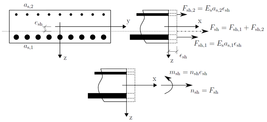 1.5.2.1. 材料刚度的减少 每个钢筋方向φ的材料刚度通过所谓的收缩影响系数ksh,c,φ减少。对于两个开裂状态c(开裂/未开裂),根据自由收缩变形εsh计算收缩轴力nsh,c,φ和弯矩msh,c,φ: