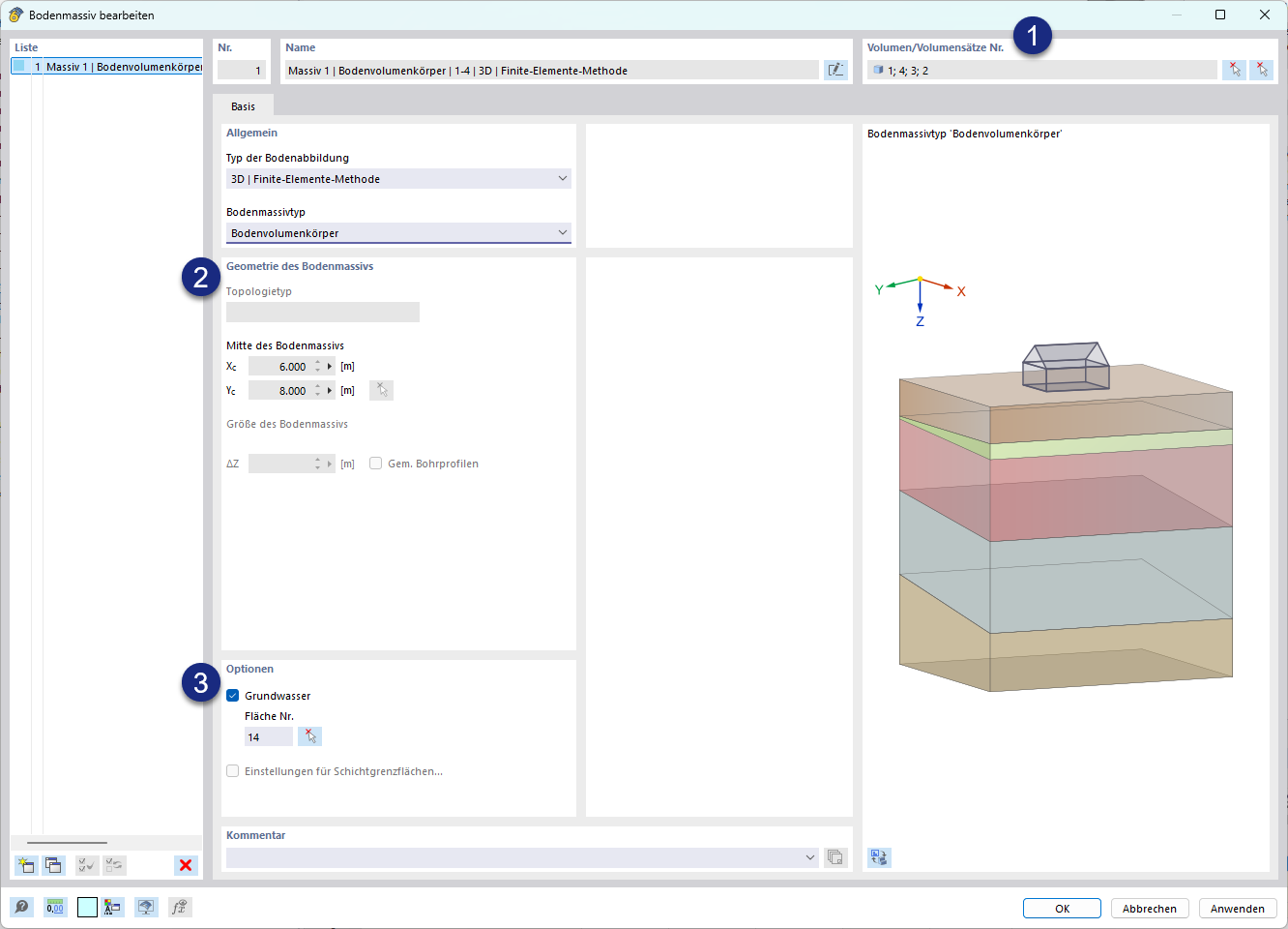 该地块的土体或“连续实体”类型的土体集必须分配给部分 (1) 中的地块。 可以直接通过输入编号或图形选择来完成。