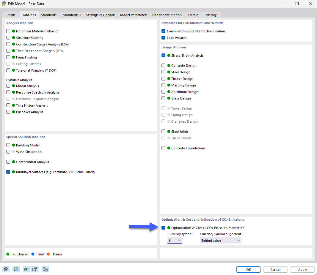 您可以在模块'模型基本数据'的选项卡中激活或停用附加模块'优化和成本/CO2排放'。