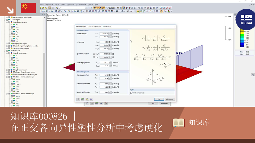 在RFEM中使用Tsai-Wu塑性准则的正交各向异性塑性已经成为可能。 使用硬化模量Ep,x或Ep,y在迭代计算中考虑材料的硬化。