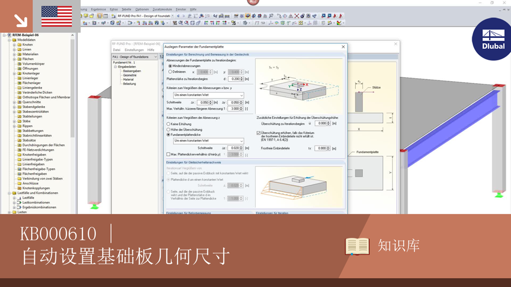 在附加模块RF-/FOUNDATION Pro中可以选择自动选择计算几何尺寸的基础板。 在例如基础板设计参数对话框中可以指定基础面积和基础板厚度增加的增量。 为了平衡岩土工程设计的需要,您也可以自动添加覆盖。