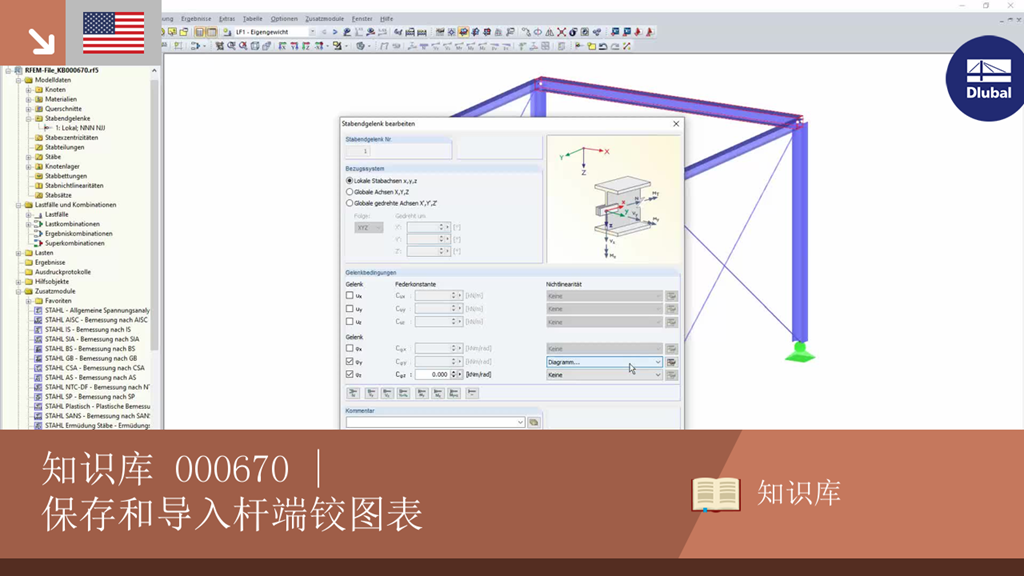 在 RFEM 5 和 RSTAB 8 中可以为杆件铰链分配非线性。 除了“固定条件”和“部分作用”外,您还可以选择“图表”选项。 如果选择“图表”选项,则用户必须要根据该功能指定杆端铰的设置。 对于各个定义点,需要指定定义铰的横坐标和纵坐标值(变形或转角以及相应的内力)。