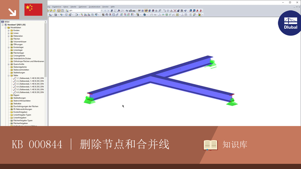 如果想要删除冗余节点但对象仍然连接,则可以右键单击相关节点,然后选择“删除节点”和“合并连接的杆件”选项。 除了杆件外,您还可以在RFEM中进行线的合并。