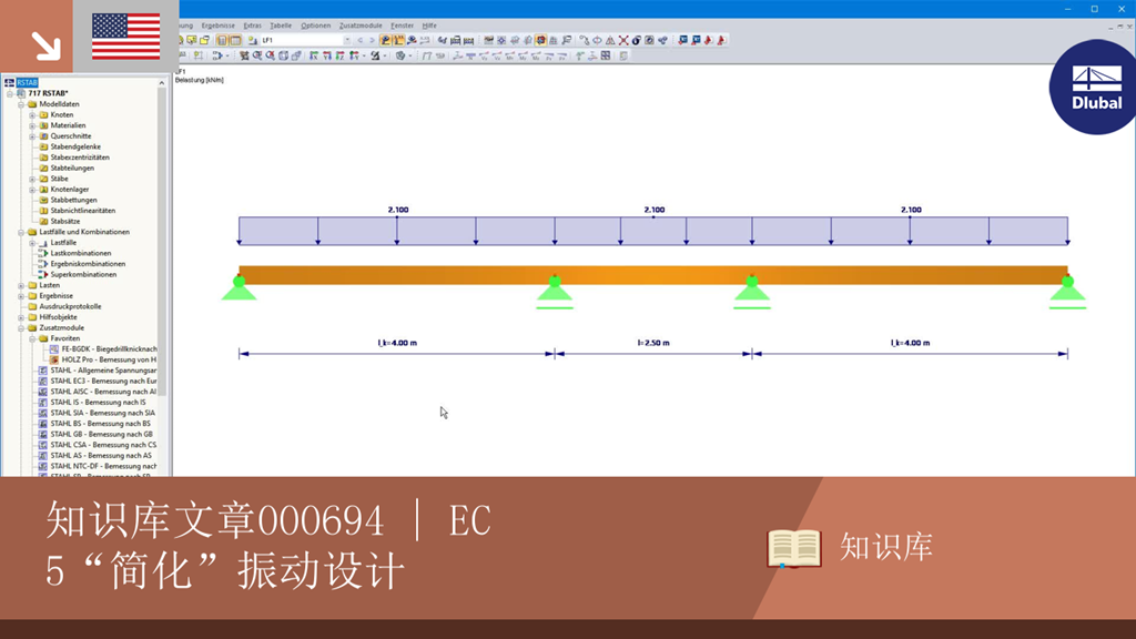使用附加模块 RF-/TIMBER Pro 可以对按照 EN 1995-1-1 的设计进行振动设计,按照 DIN 1052 进行设计。 这种情况下永久和准永久作用下挠度的变形不能超过一个极限值(根据 DIN 1052 为 6 mm)。 对于受恒定荷载作用的带铰接的单跨梁,考虑自振频率和挠度之间的关系,那么使用 6 mm 计算得出的最小自振频率约为 7.2 Hz。