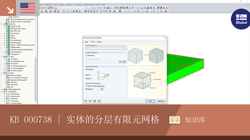 对于实体,还有有限元网格的设置。 除了整体性的有限元网格细化之外,还可以排列分层的有限元网格。 在该选项中,可以在两个平行面之间进行定义的有限元单元划分。 该选项特别适用于非常大的实体几何体和较小的高度。