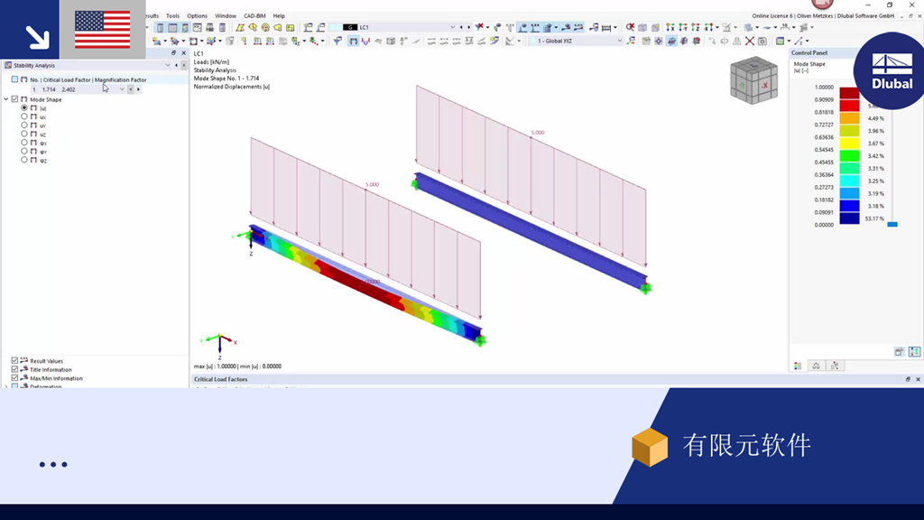 在视频中,我们展示了杆件偏心荷载的定义及其对横向扭转屈曲临界荷载系数的影响。 在这种情况下,施加在受压翼缘上的荷载会导致不稳定,RFEM 中对此进行了正确考虑。 我们使用 RFEM 6 Add-Ons Stability Analysis and Torsion Warping (7DOF)。