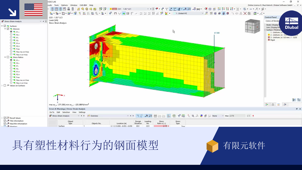 在本例中,应力分析是在考虑塑性材料模型的情况下进行的。为此激活了模块“非线性材料特性”。 这些面都有一个各向同性的塑性材料模型。 结果应该使用“网格单元上的常数”选项进行位移。