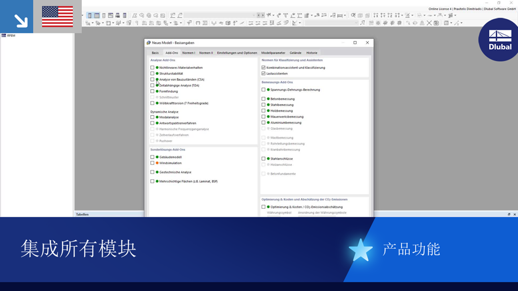 所有模块都集成在 RFEM 6 或 RSTAB 9 中。 它们之间可以相互影响,例如通过模块“施工阶段分析(CSA)“考虑找形过程等。