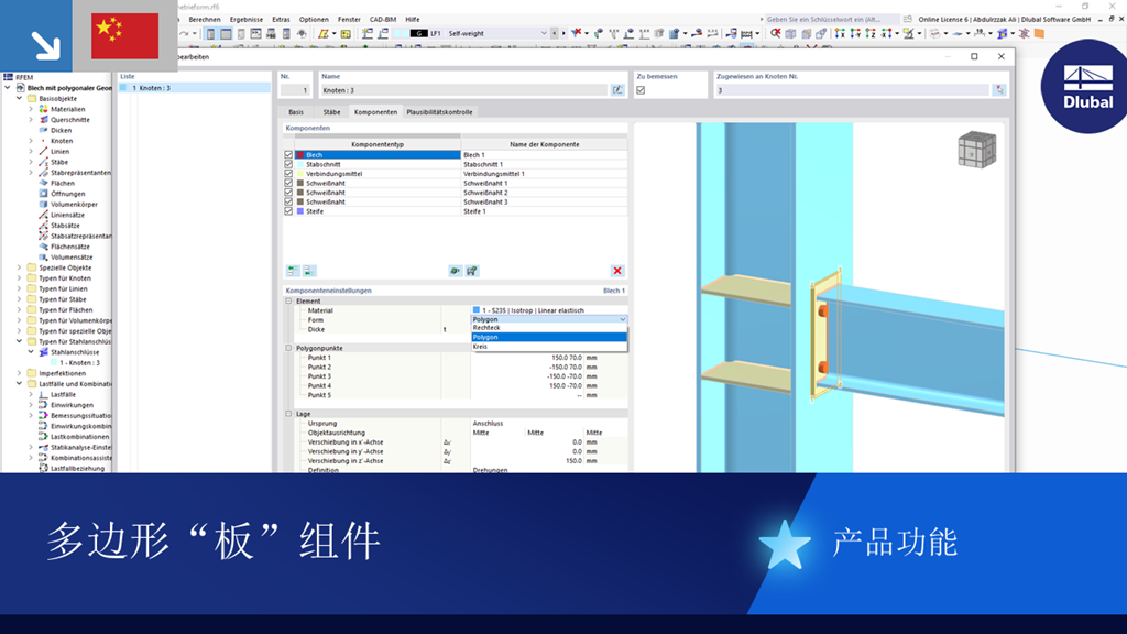 在“钢结构节点”模块中,用户可以选择不同形状的板组件。 除了“矩形”和“圆形”外,现在还提供“多边形”选项。 可以通过输入顶点坐标来定义所需多边形。