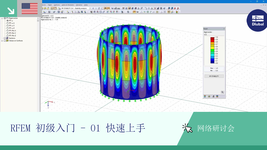 该网络课堂演示了如何使用Dlubal结构分析设计软件按照欧洲规范EN 1993-1-5进行壳体结构的翘曲稳定性验算。