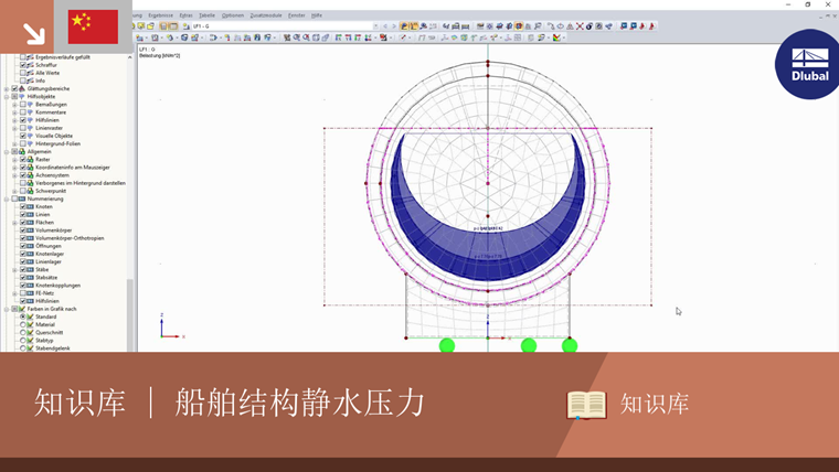 Eine senkrechte Wirkung zur Wandung erreicht man durch Wahl der Lastrichtung z "Lokal bezogen auf wahre Fläche". 通过切换到相应方向上的线性荷载分布,并且在投影平面上的定义点处分配荷载坐标,可以达到取决于液面的线性分布。