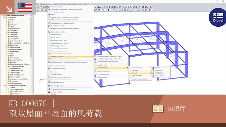 为了将风荷载施加到屋面,分析软件RFEM 5或RSTAB 8提供了一个生成的软件,用于生成倾斜的山墙屋顶形状和平面平屋顶形状。 荷载生成器对双坡屋面形状的特殊情况是小于5度的山墙屋面形状的荷载产生。 在这种情况下,生成器对等效的平屋面施加了荷载说明。