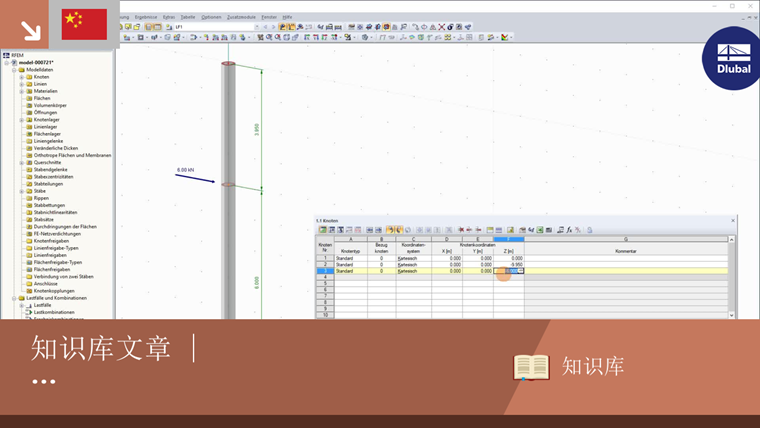 In den Bildern ist dargestellt, wie mit dem Eintrag $1.1(F3) auf eine Koordinate in Tabelle 1.1 verwiesen wird. 单元格F3的编号在方括号中。 节点的Z坐标发生变化时,节点荷载将自动由此调整进行调整。 因此荷载就取决于节点的位置。