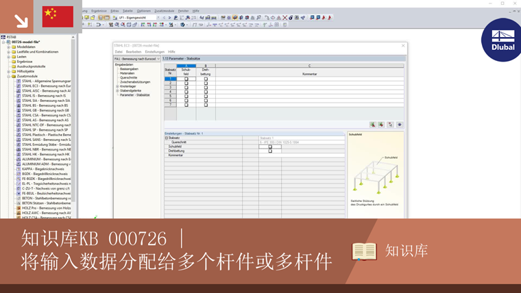 In RF-/STAHL EC3 können gleichzeitig mehreren Stäben beziehungsweise Stabsätzen dieselben Eingabedaten zugewiesen werden. Die gleichzeitige Zuweisung der Eingabedaten ist für Zwischenabstützungen, effektive Längen, Knotenlager, Stabendgelenke sowie Schubfeld und Drehbettung möglich.