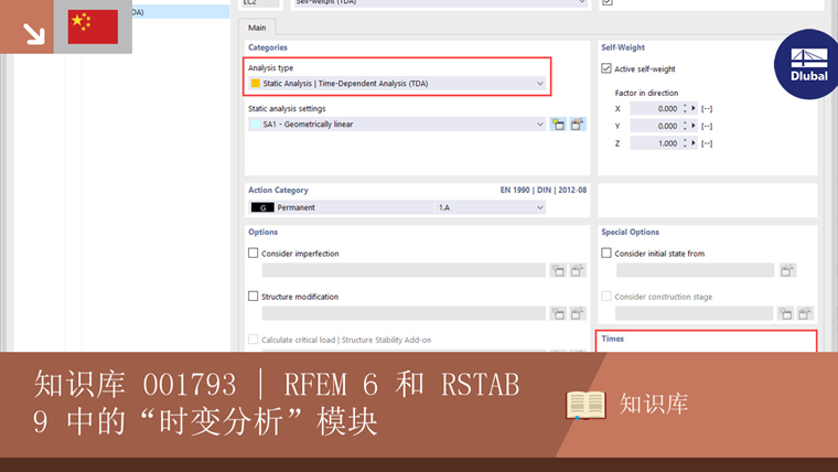 In both RFEM 6 and RSTAB 9 it is possible to consider the time-dependent factors using the "Time-Dependent Analysis (TDA)" add-on. Once purchased, you can activate this add-on in the Base Data as shown in Image 1.